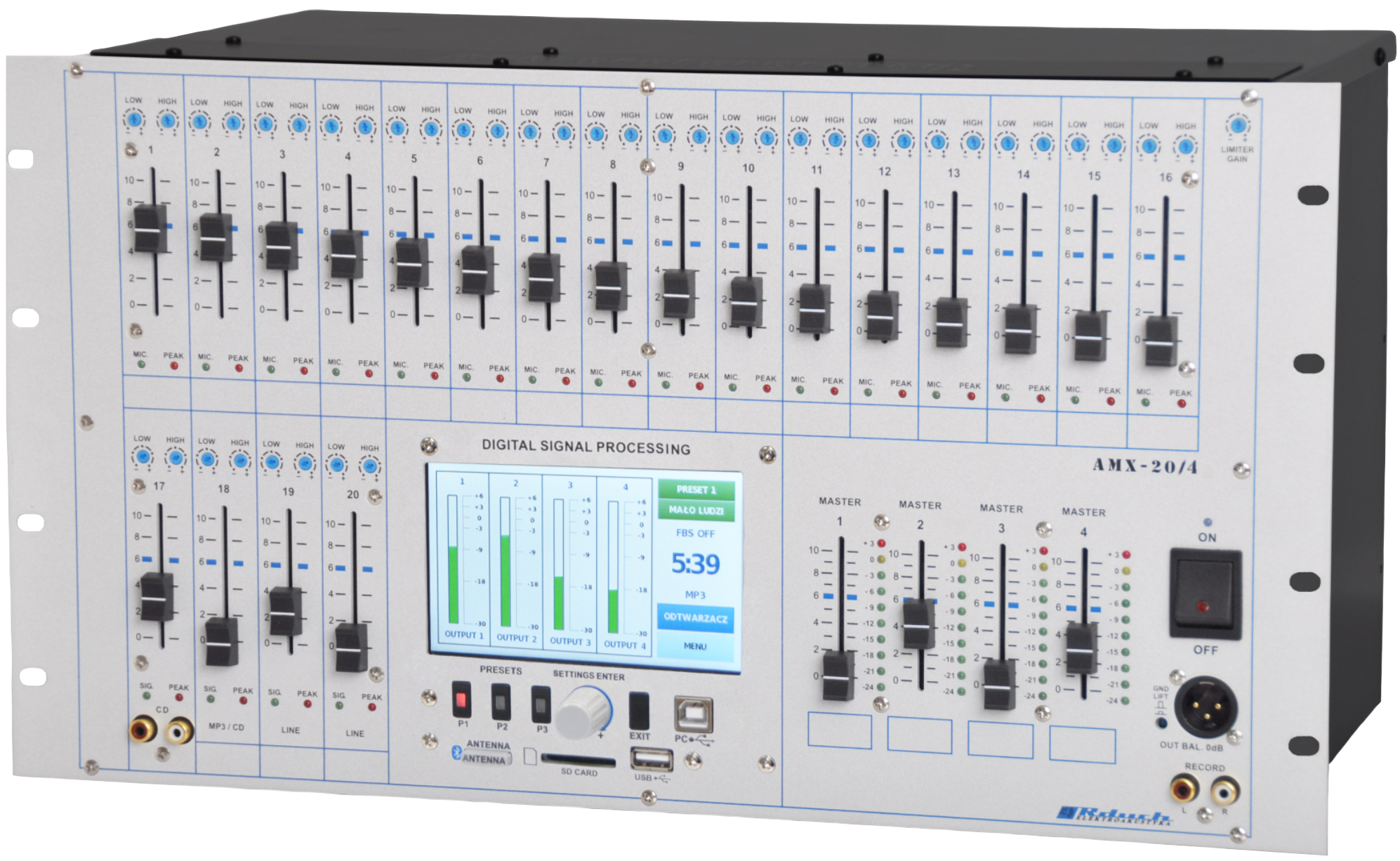 AMX-20/4 to nowoczesny mikser wyposażony w procesor sygnałowy DSP, który umożliwia precyzyjną korekcję charakterystyki dźwięku w obiektach o bardzo trudnych warunkach akustycznych. Mikser uaktywnia tylko te mikrofony, które używane są w danym momencie, co eliminuje wpływ dźwięku otoczenia dochodzący z nieużywanych kanałów mikrofonowych.