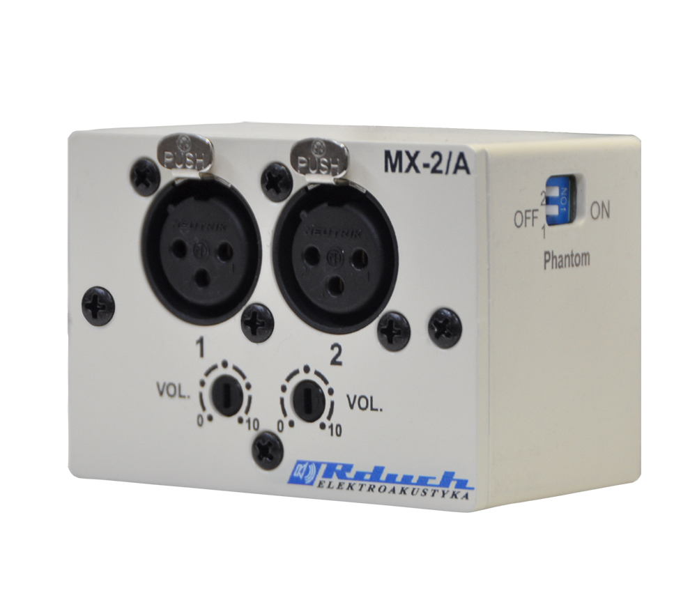 Minimikser MX-2/A służy do rozszycia sygnału mikrofonowego. Przydatny jest w sytuacjach gdy dostępny jest tylko jeden przewód mikrofonowy, a potrzebne są dwa mikrofony. MX-2/A posiada dwa wejścia symetryczne z włączanym zasilaniem Phantom oraz regulowanej czułości. Minimikser posiada wyjście symetryczne, które łączymy na jeden kanał mikrofonowy z zasilaniem Phantom (dla zadziałania minimiksera konieczny jest kanał mikrofonowy z zasilaniem Phantom). Do wejść MX-2/A możemy podpiąć mikrofon pojemnościowy, dynamiczny oraz bezprzewodowy.