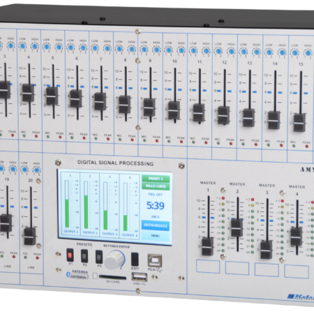 - dwa niezależne tory sumy z regulacją barwy i wzmocnienia z sześciopunktowym wskaźnikiem wysterowania i wyjściami symetrycznymi (gniazda XLR) z odłączaną masą