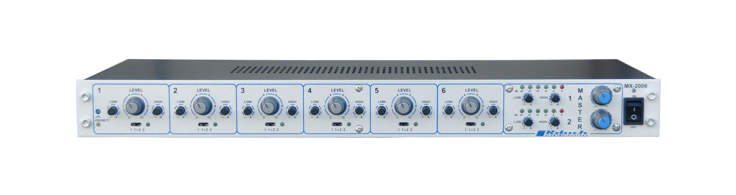 - odrębna regulacja wzmocnienia i barwy (Bas, Sopran) dla każdego kanału wejściowego
